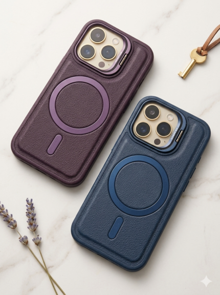 Capa Premium Borda de Couro com MagSafe Suporte na Câmera e Película de Lente de Câmera