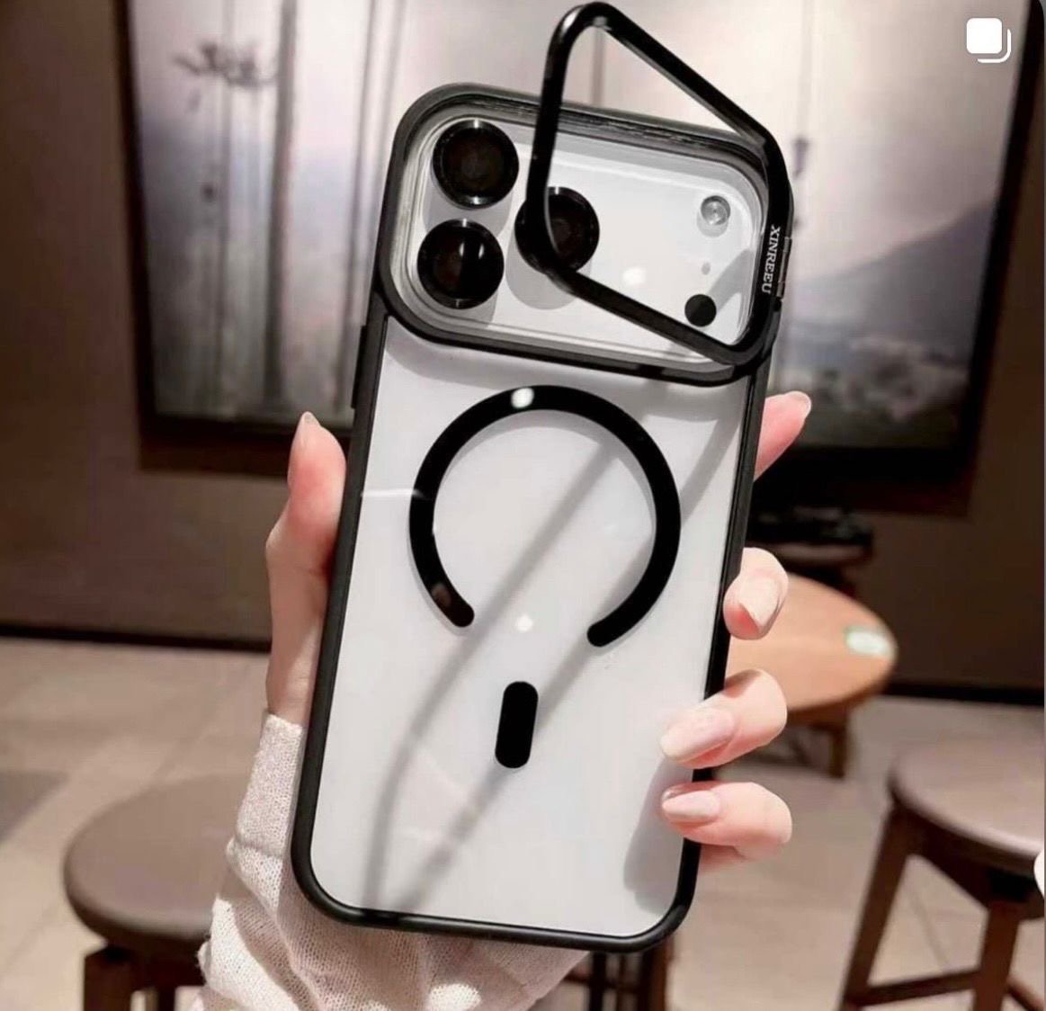 Capa Premium Acrílica Magsafe com Suporte na Câmera e Película de Lente